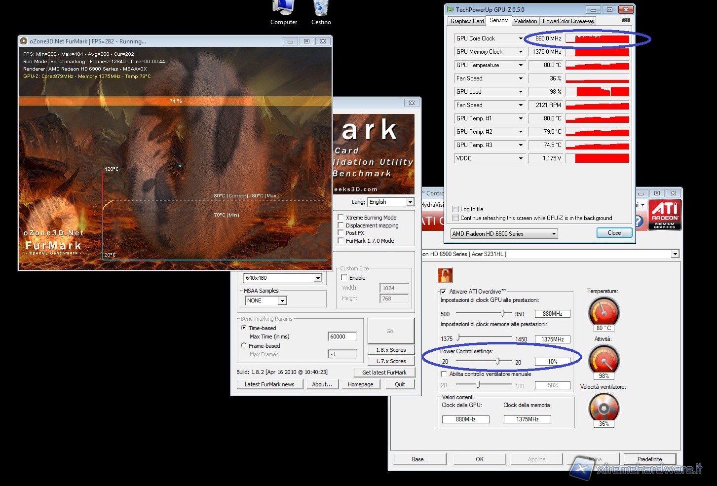 Analizzando le temperature possiamo notare che, anche se Cayman è un chip piccolo, scalda molto, e questo è dovuto alla sua particolare architettura ed alla sua frequenza molto spinta. Usando il benchmark tool FurMark abbiamo raggiunto una temperature prossima ai 90° C, temperatura molto simile alla GTX 480 che è notoriamente una scheda molto calda. La ventola della HD 6970 oscillava ad una percentuale compresa tra il 38% e il 40% del massimo regime di rotazione. Nonostante il regime non fosse elevato, la rumorosità della scheda grafica ci è sembrato molto evidente. Anche se in game le temperature sono inferiori, avremmo certamente preferito un sistema di dissipazione più silenzioso. Sicuramente non mancheranno partner di AMD interessati nel realizzare un sistema di dissipazione più efficiente rispetto a quello standard. Sapphire si distingue solitamente proprio per questa peculiarità, fornendo modelli custom con sistemi di dissipazione molto efficienti.